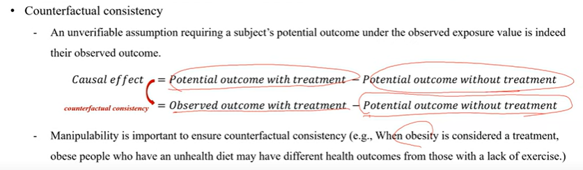 비만이 있을 때의 Potential outcome을 구해야 하는데 비만은 각자 다른 이유로 비만이 된 사람들이 있기 때문에 원인에 따라서 관촬되는 healty outcome은 다름!!!!