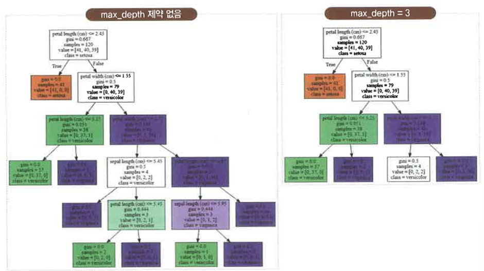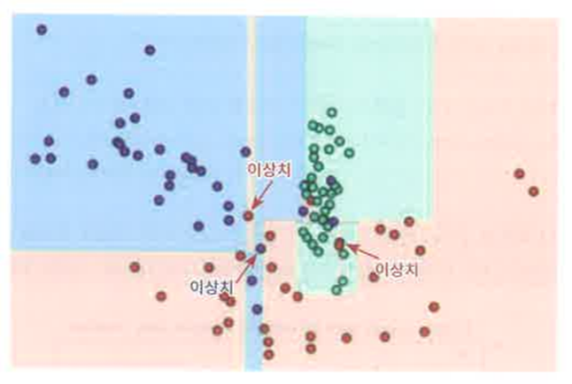 è 규칙 생성 로직을 미리 제어하지 않으면 완벽하게 클래스 값을 규별하기 위해 트리 노드를 계속 만들어서 쉽게 과적합됨