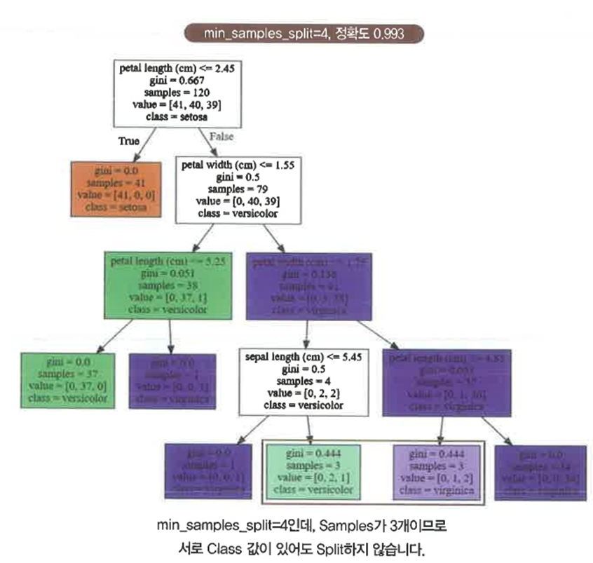 - 깊이가 깊어지면 min_samples_split 설정대로 최대 분할해 과적합함