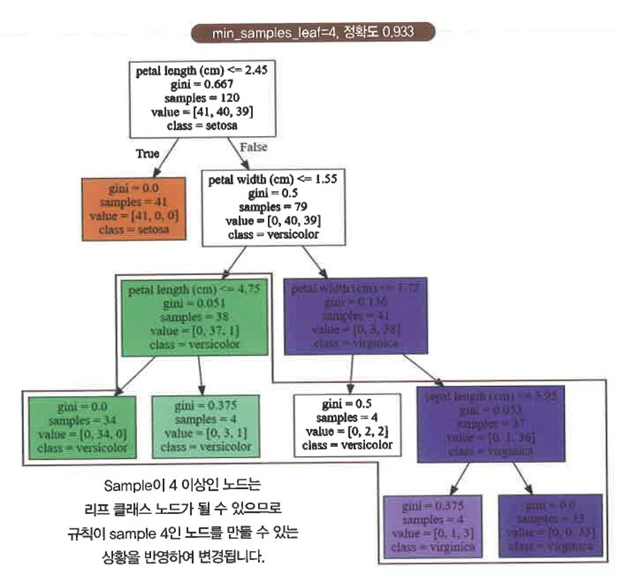 Min_samples_leaf = 4로 설정시 샘플이 4 이하이면 리프 노드가 되기 때문에 지니 계수 값이 크더라도 샘플이 4인 조건으로 브랜치 노드가 줄어들고 결정 트리가 더 간결해짐